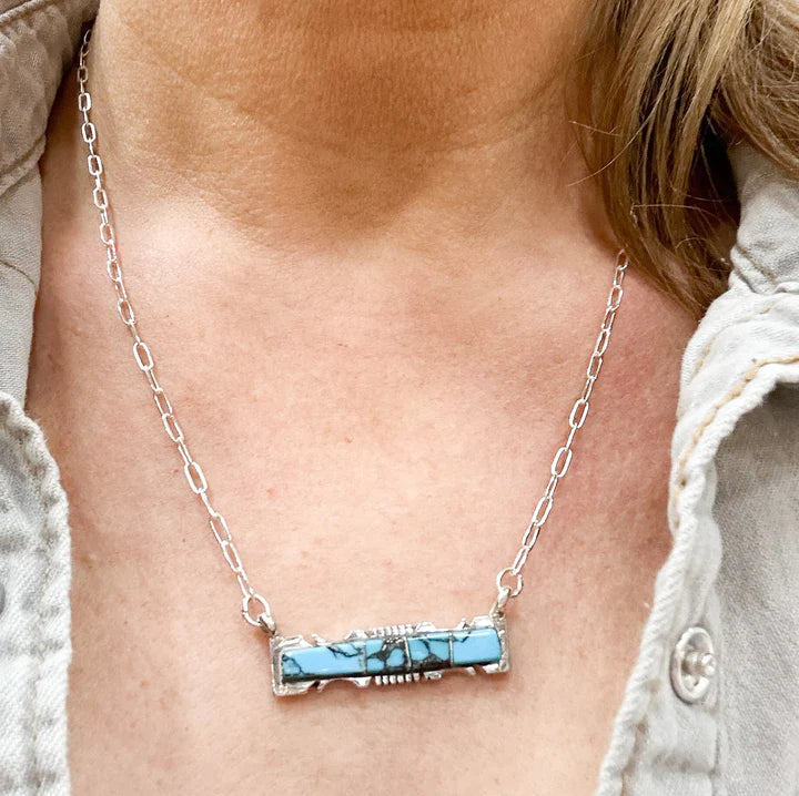This sterling silver bar necklace is inlaid with compressed turquoise with bronze matrix and silver dividers with a fancy wire border. Bar measures 1 3/8" long across by 5/16" wide and has an 18" sterling silver paper clip chain. Bar is Navajo handmade and inlaid by Steve Francisco.